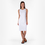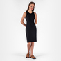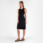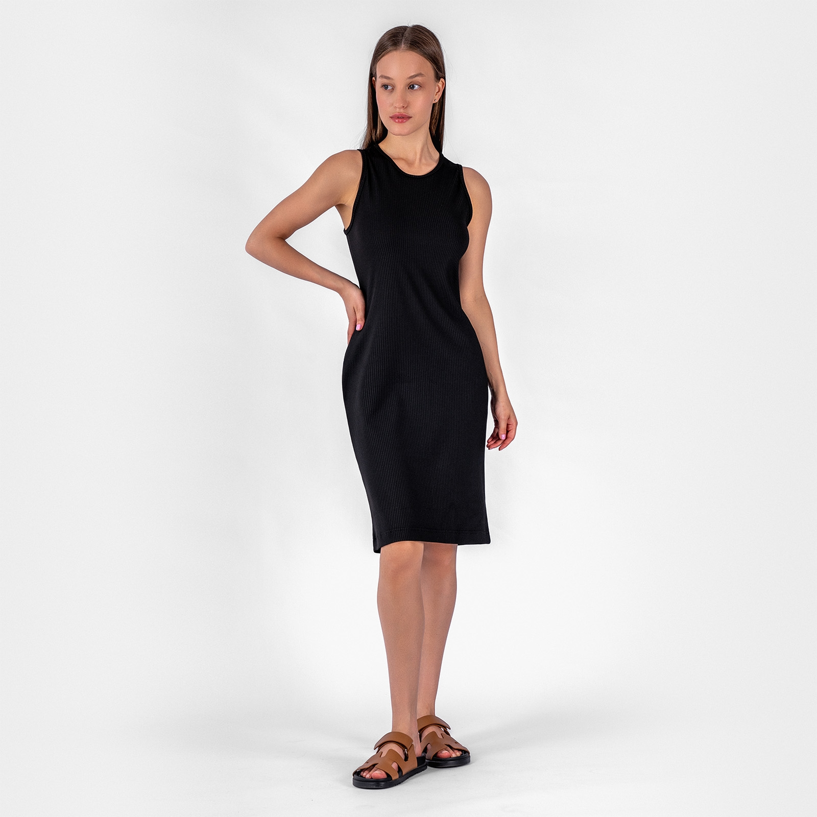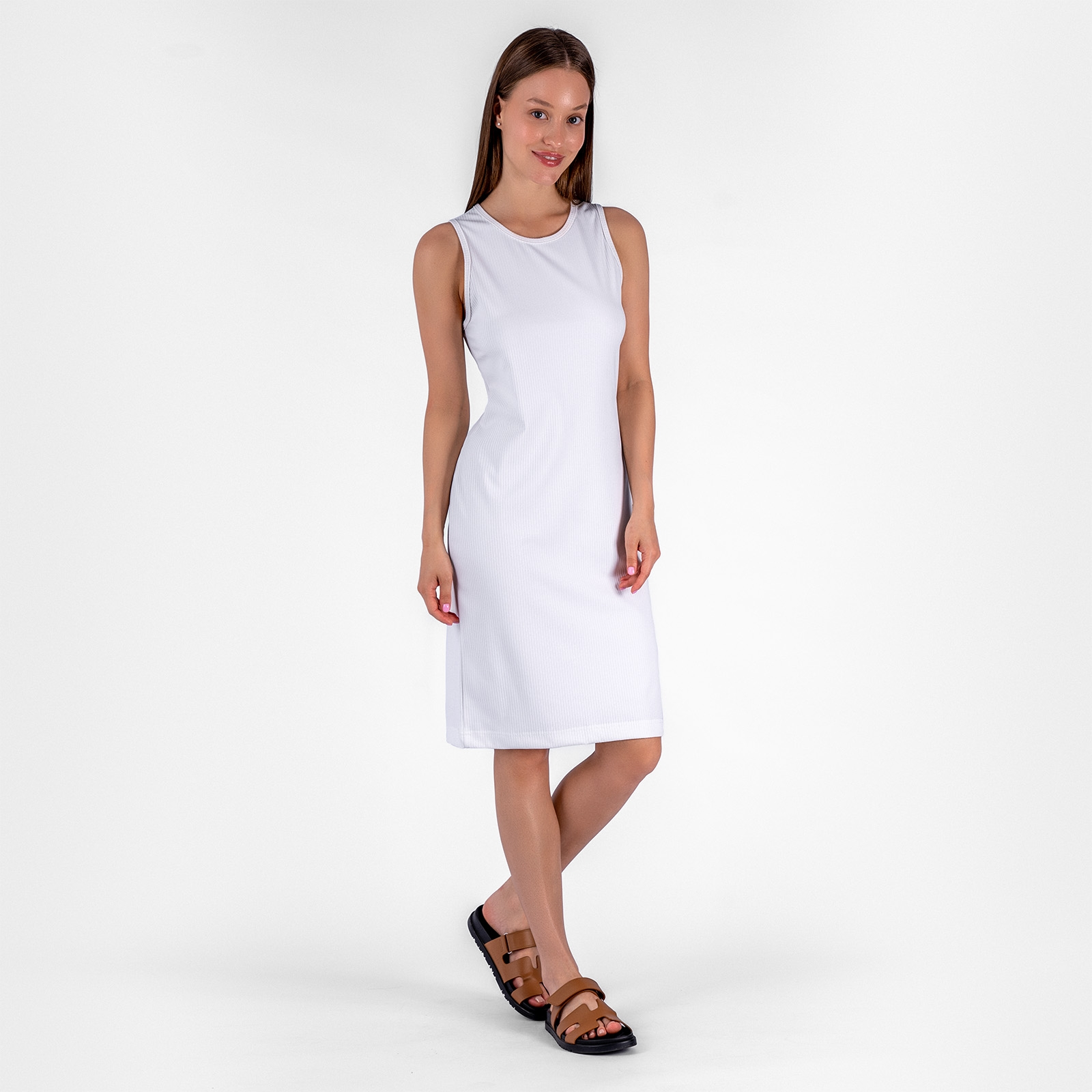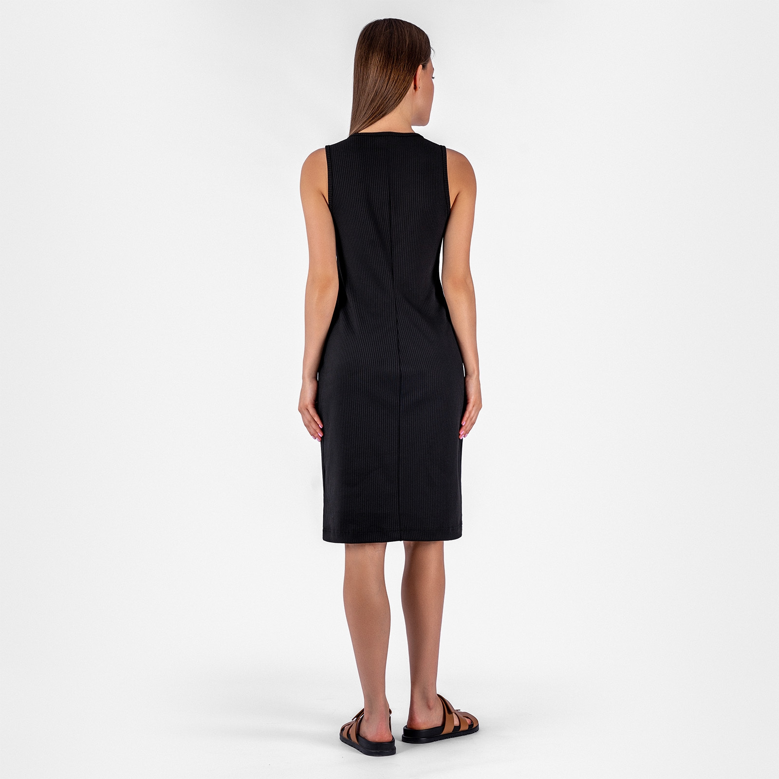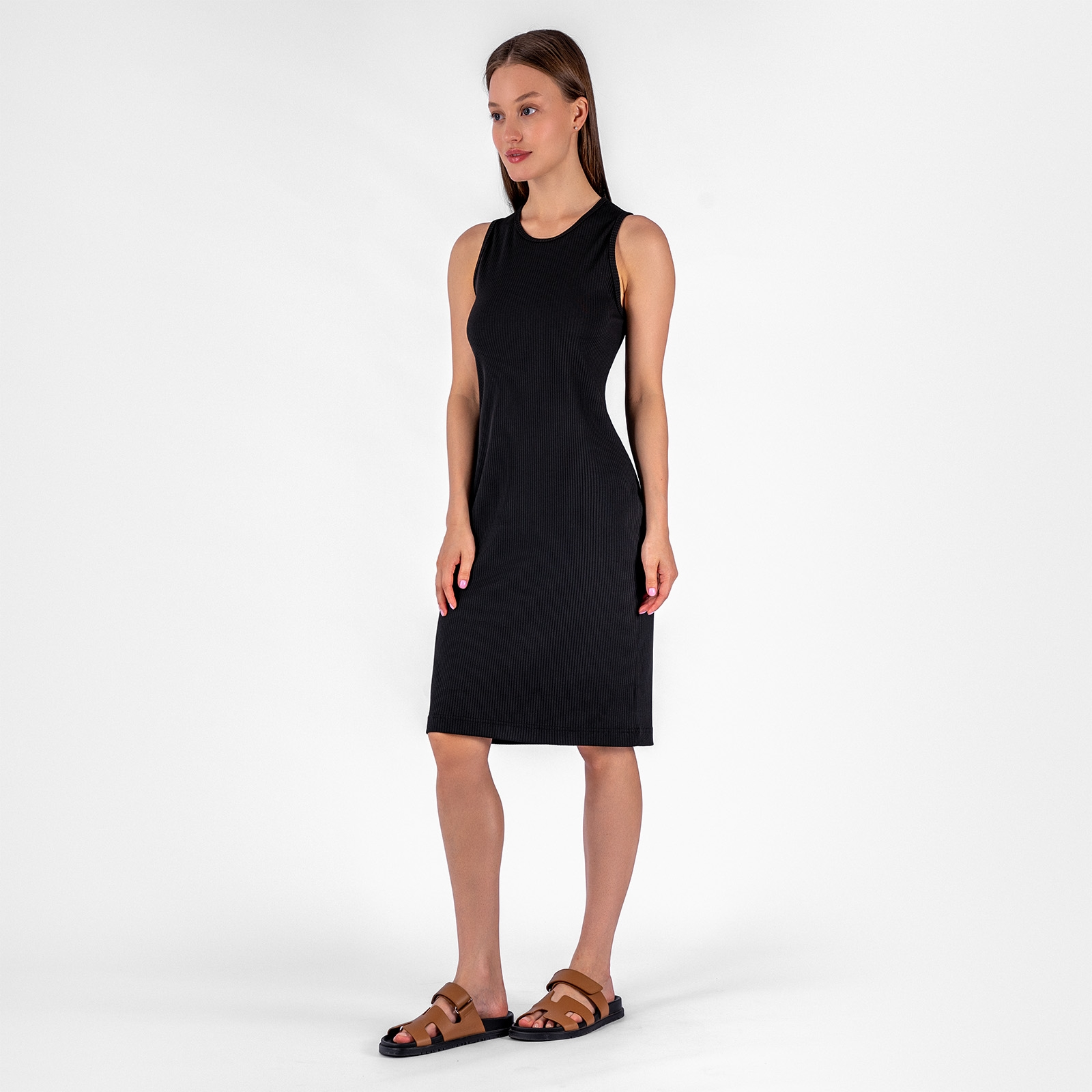 Платье приталенного силуэта на широких лямках.