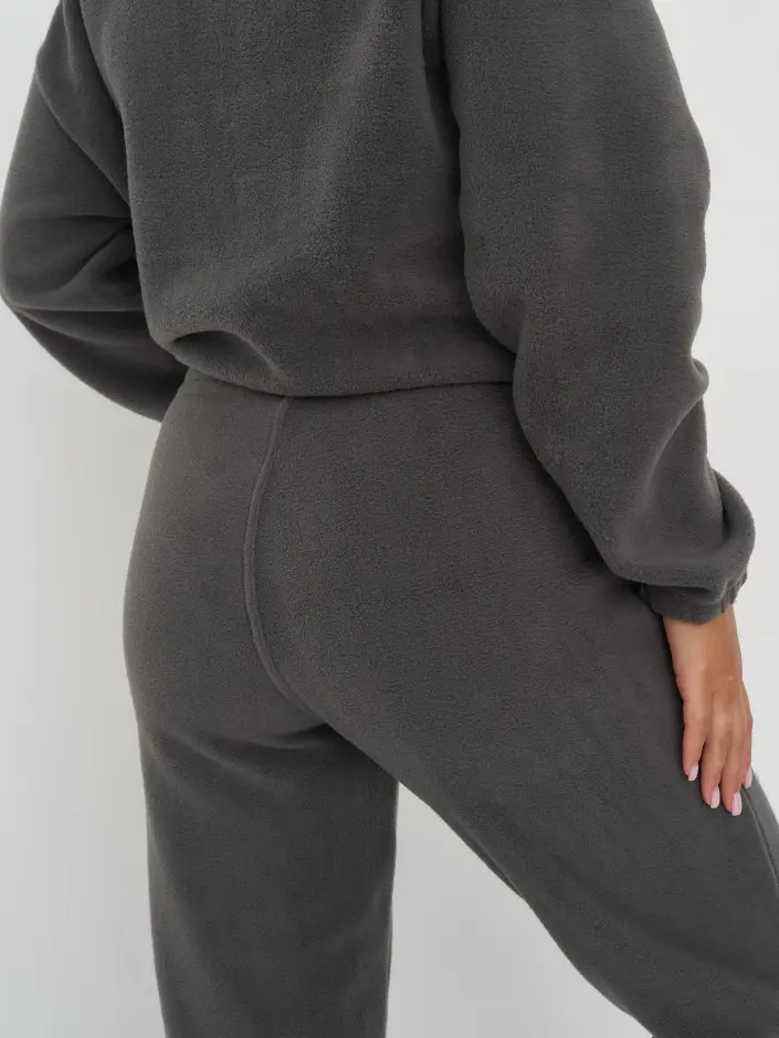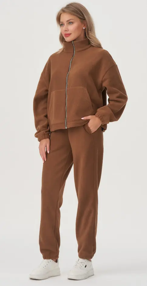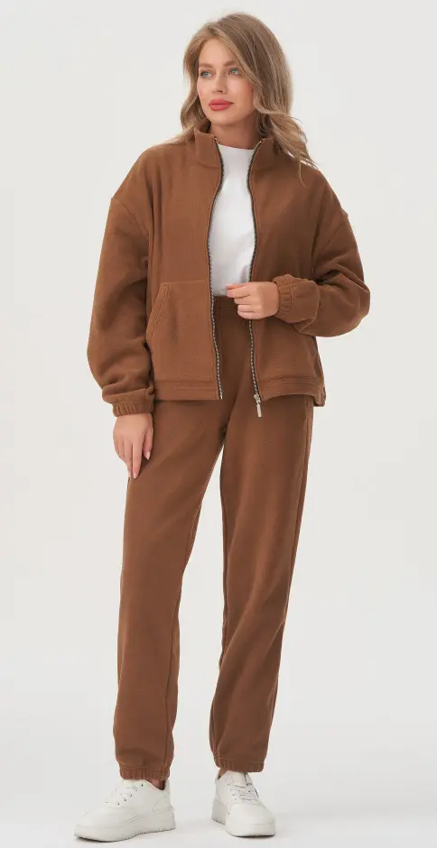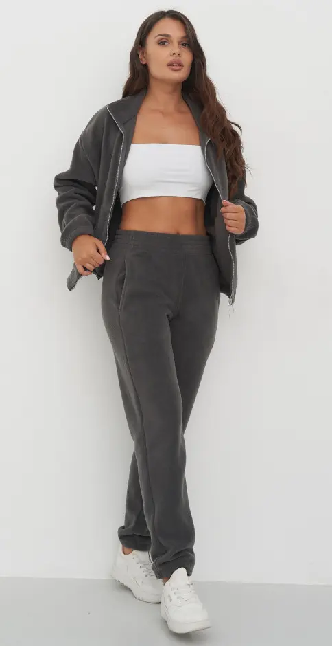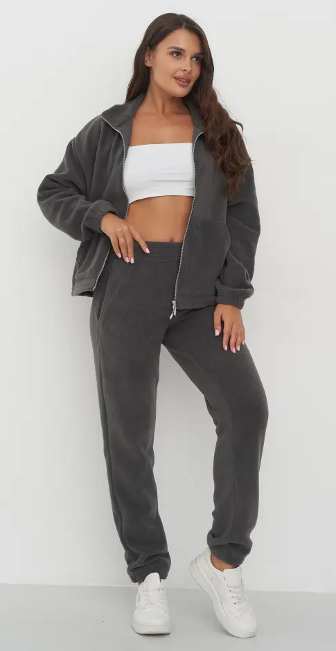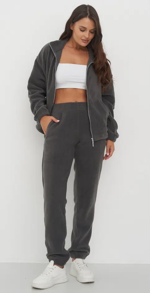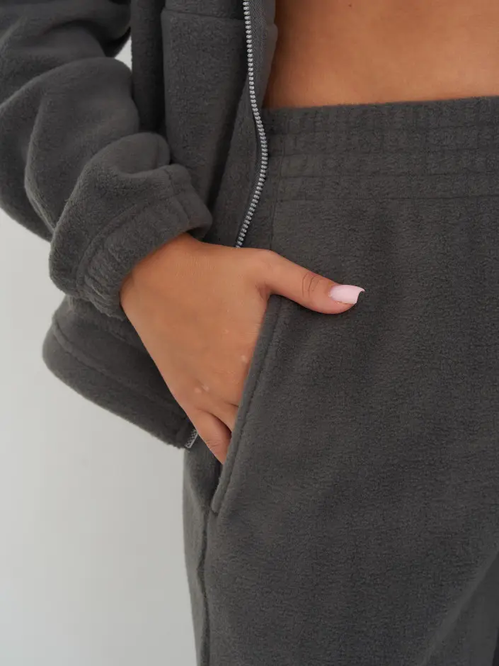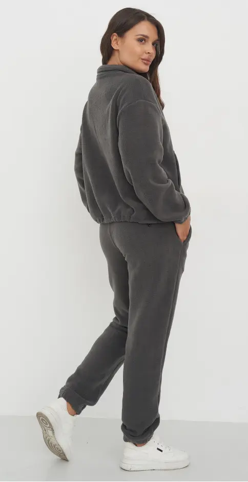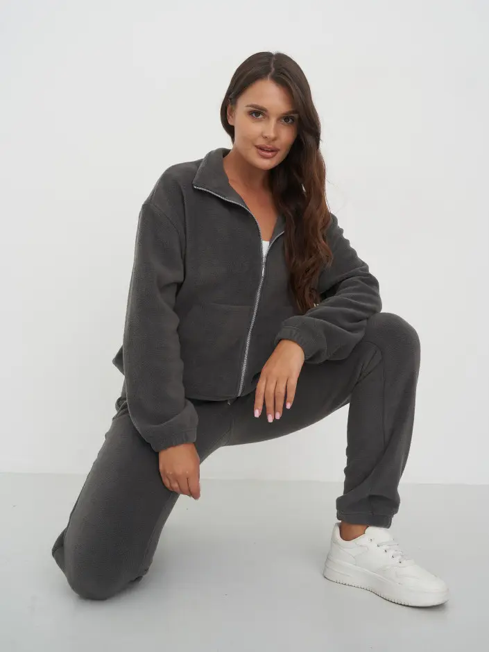 Толстовка из флиса свободная на молнии, с карманом кенгуру, воротник стойка, низ изделия собирается на резиновый шнур.
