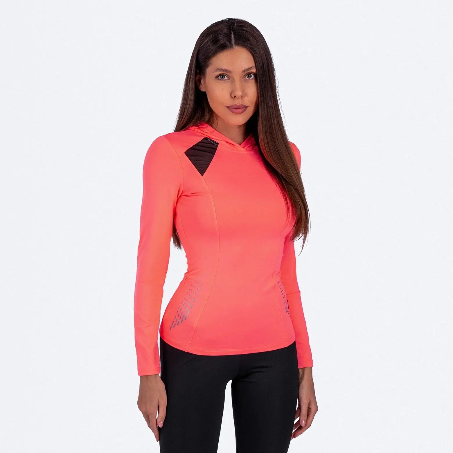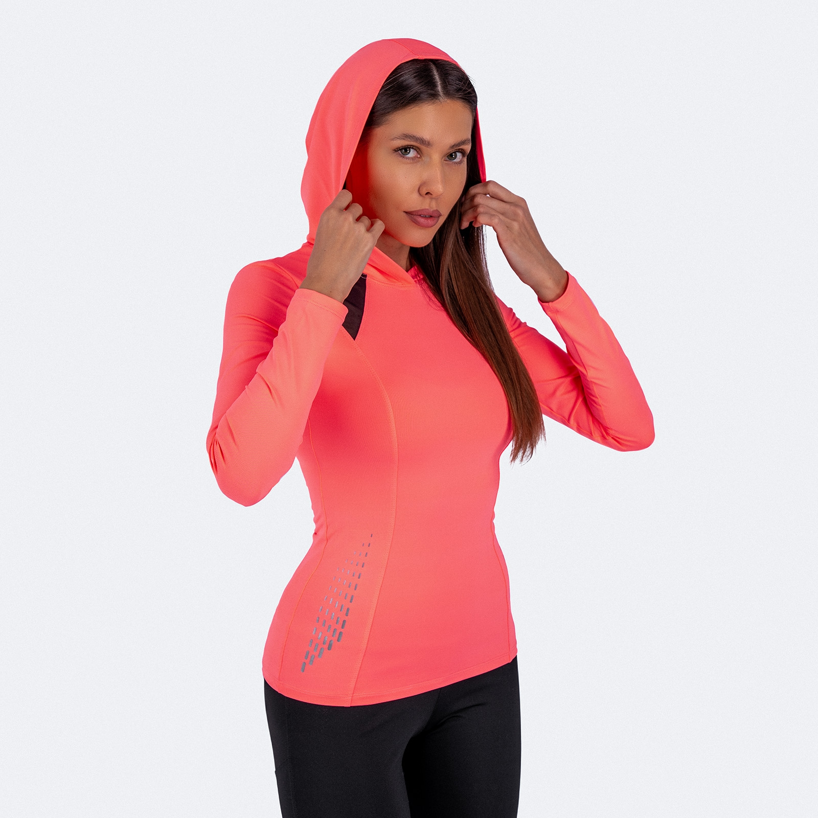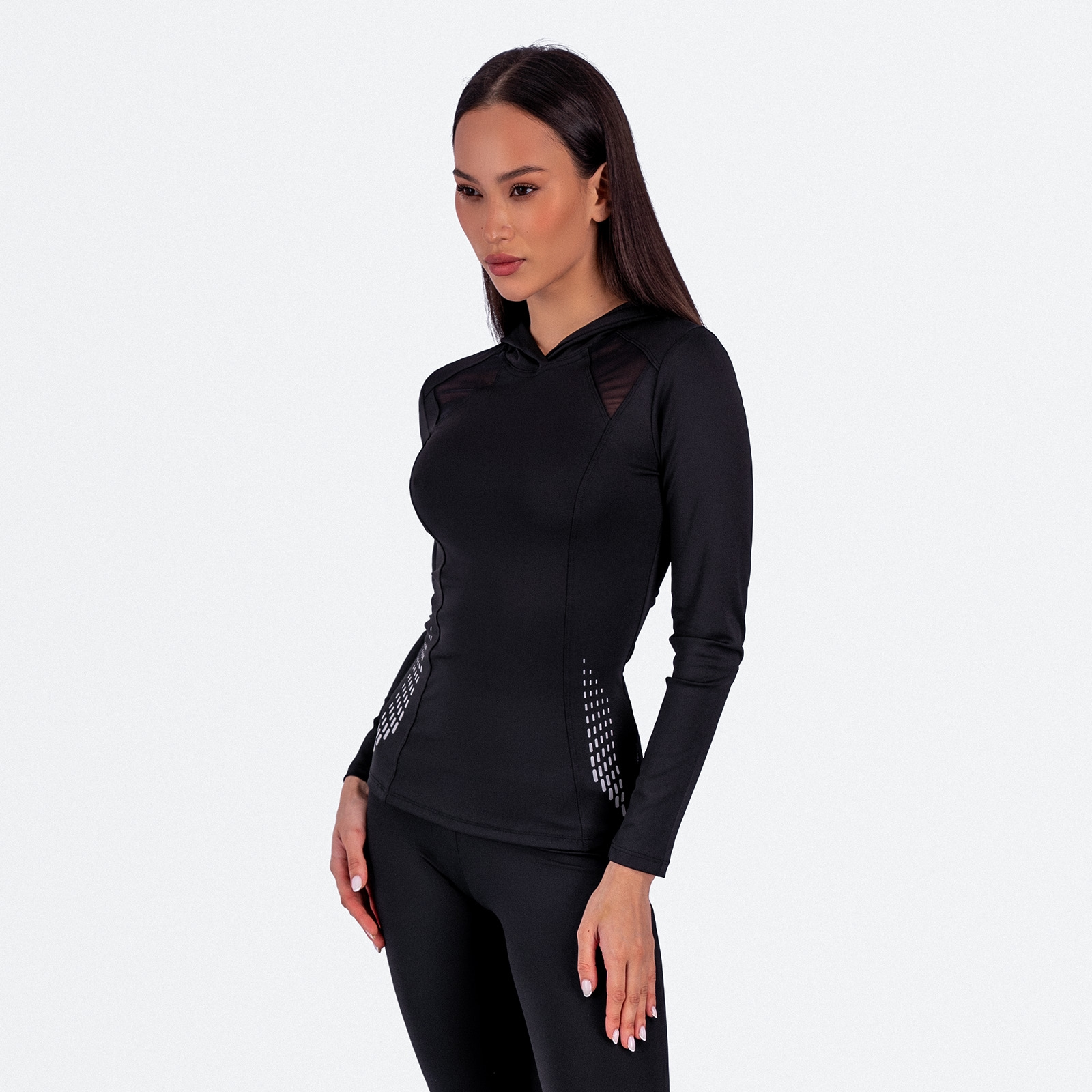 Женский лонгслив прилегающего силуэта с капюшоном и вставками из сетки (термо "светоотражающая").