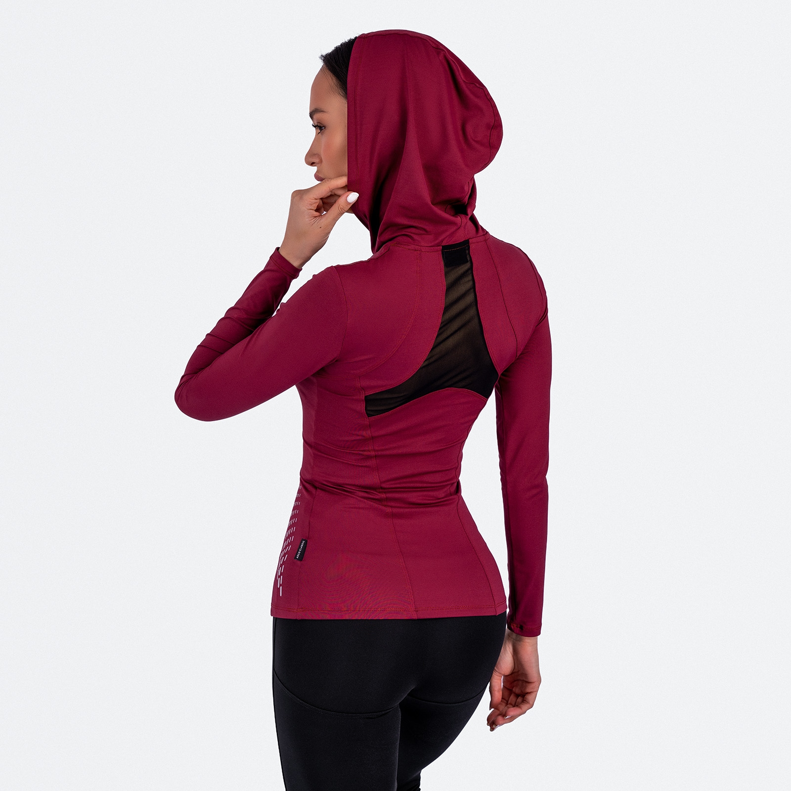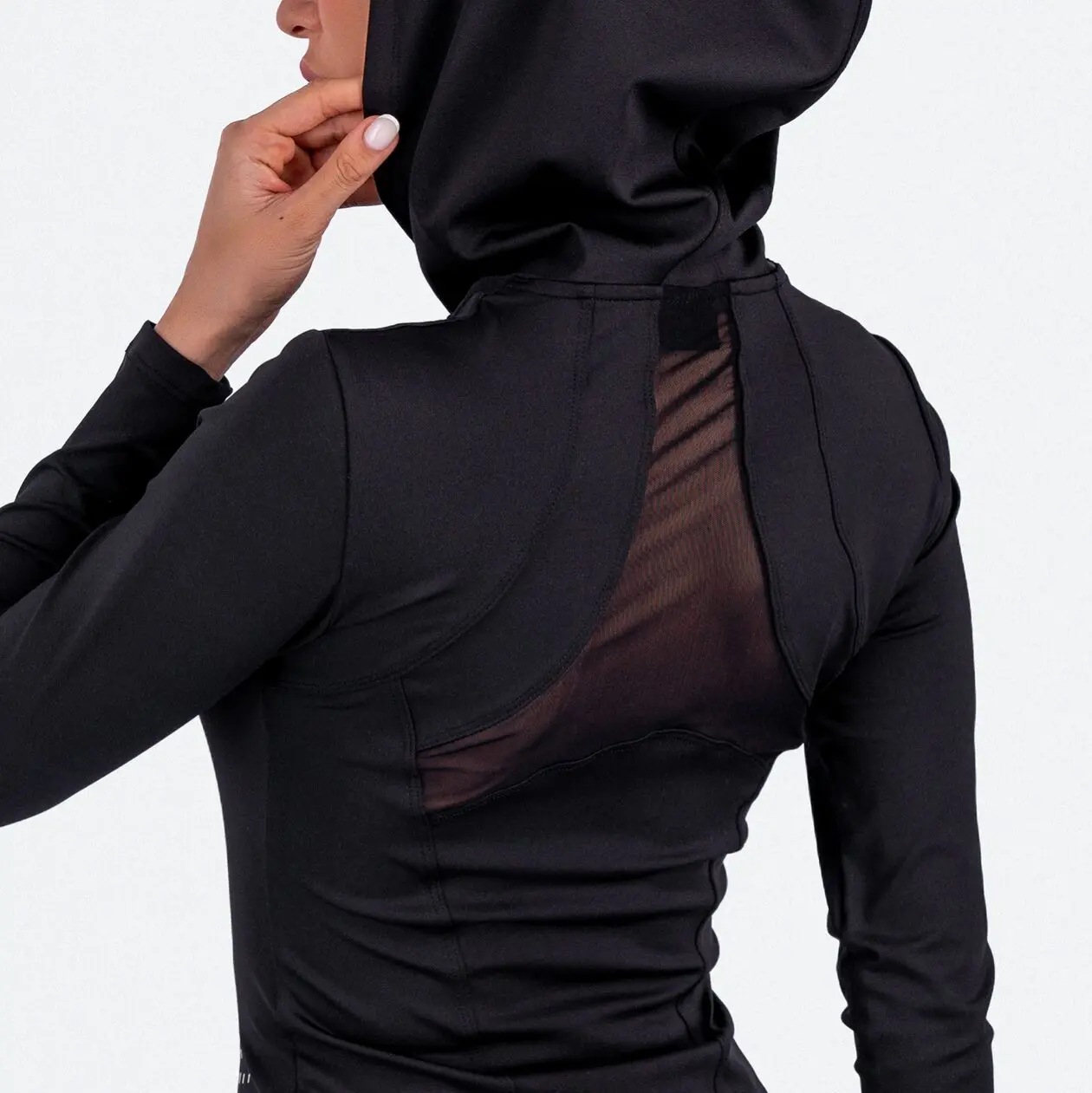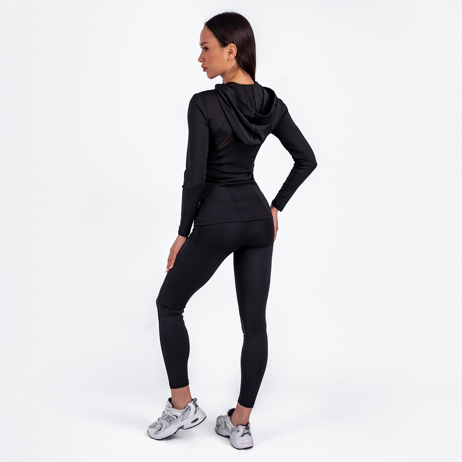 Женский лонгслив прилегающего силуэта с капюшоном и вставками из сетки (термо "светоотражающая").