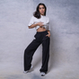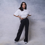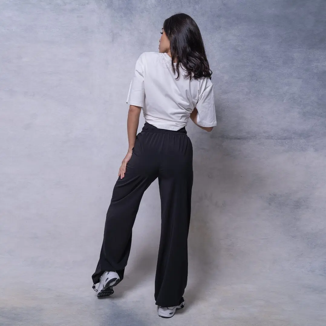 Женские брюки с притачным поясом, с карманами в боковых швах, по низу штанин кулиска с фиксаторами.