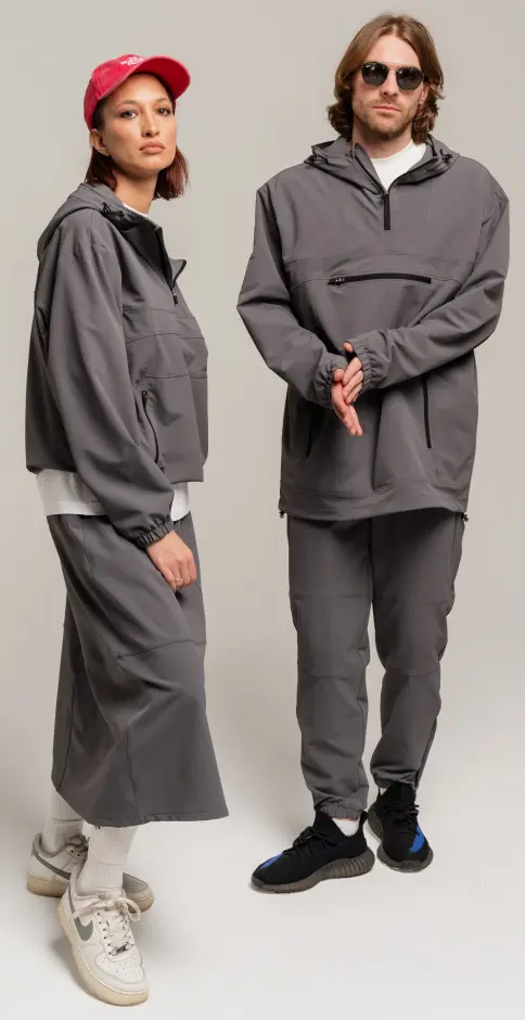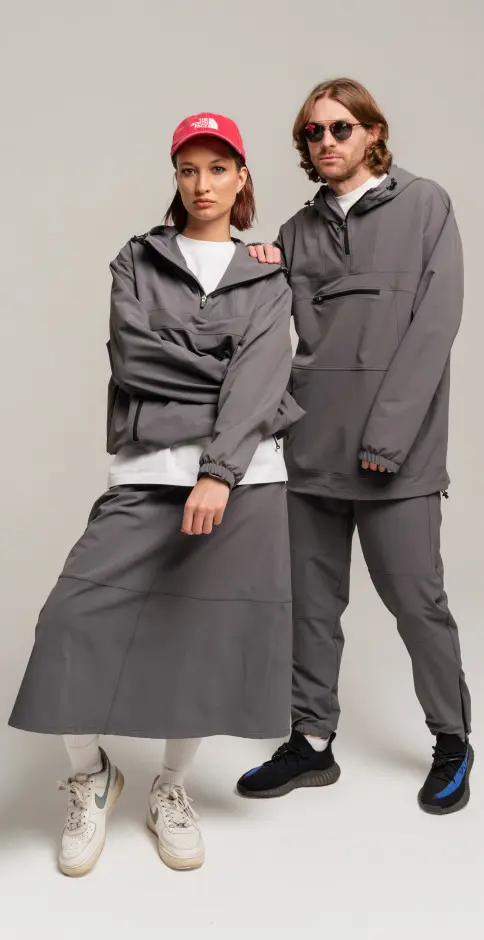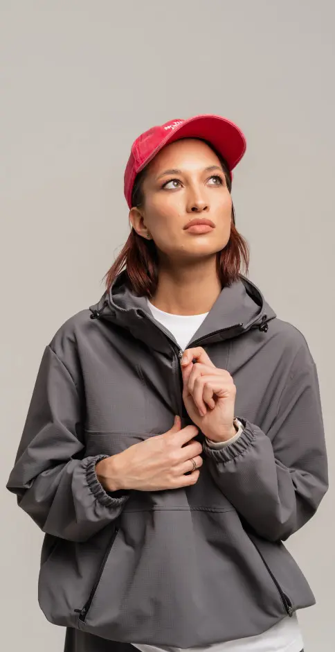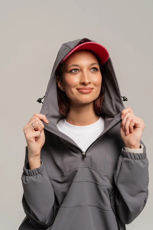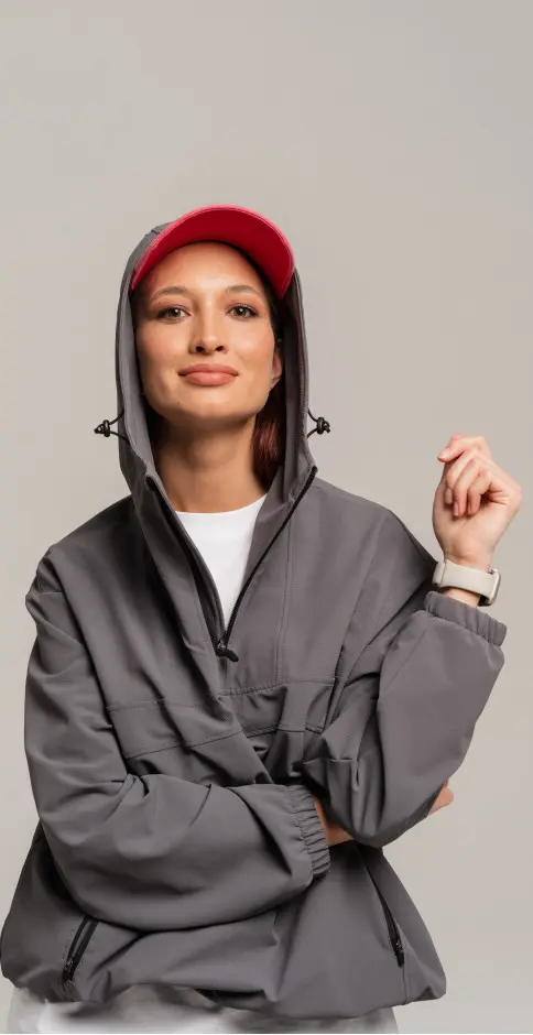 Анорак с центральной застежкой на молнии,с капюшоном,боковыми карманами на молниях,низ на регулируемой резинке.