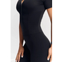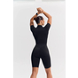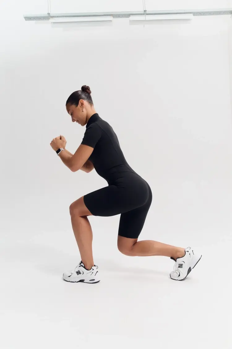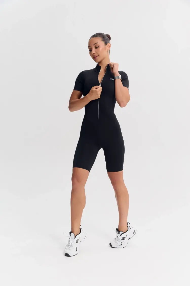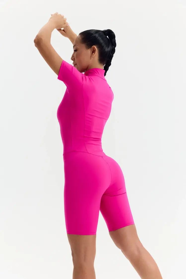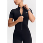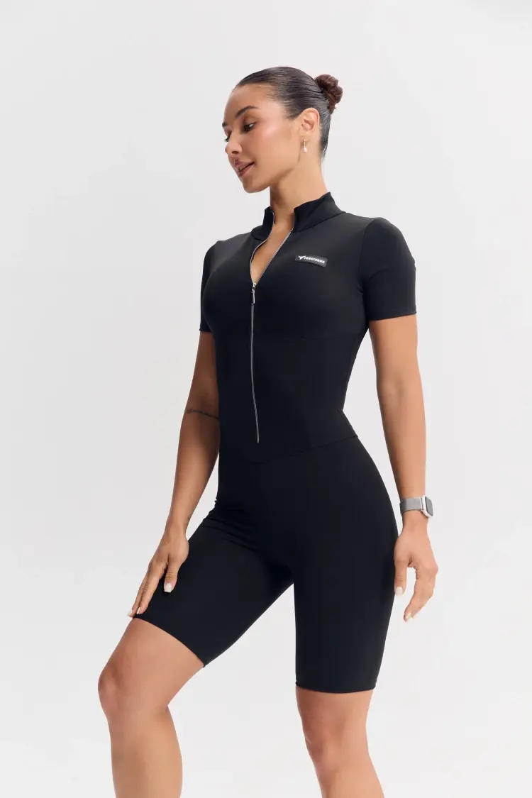 - Облегающий комбинезон с коротким рукавом и молнией спереди — акцентный образ для активных тренировок и athleisure-луков.